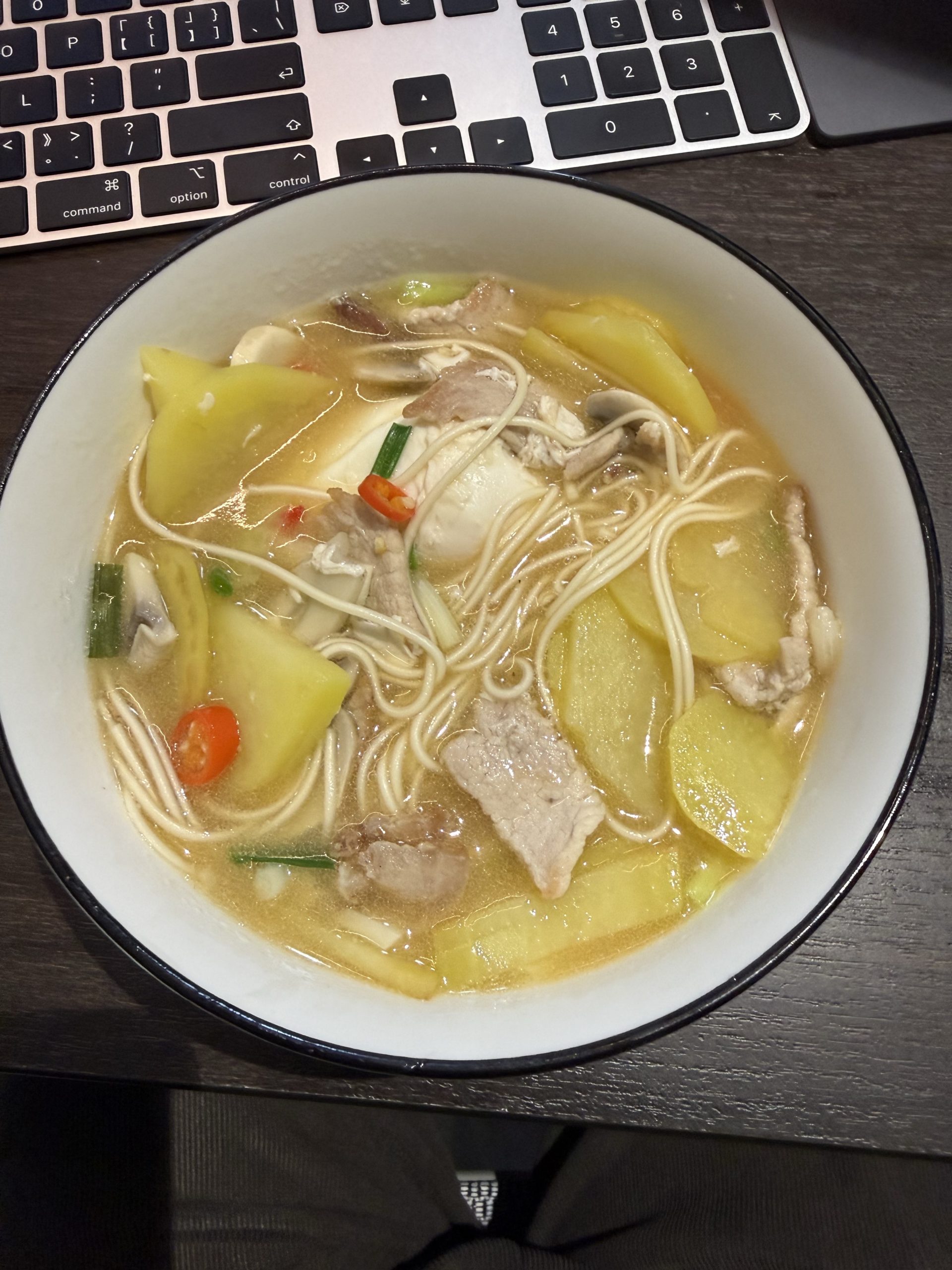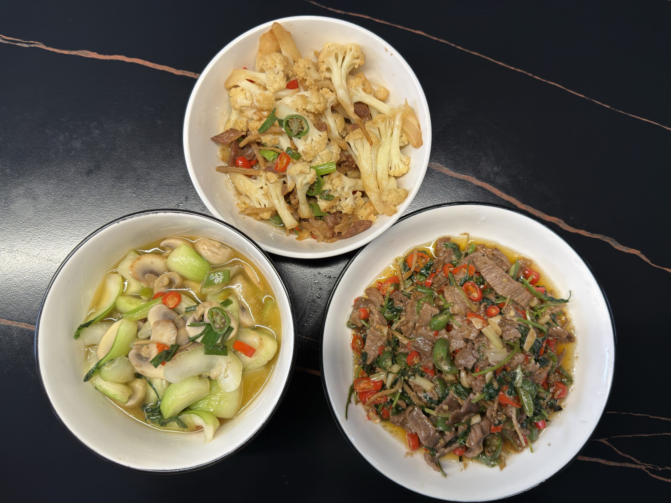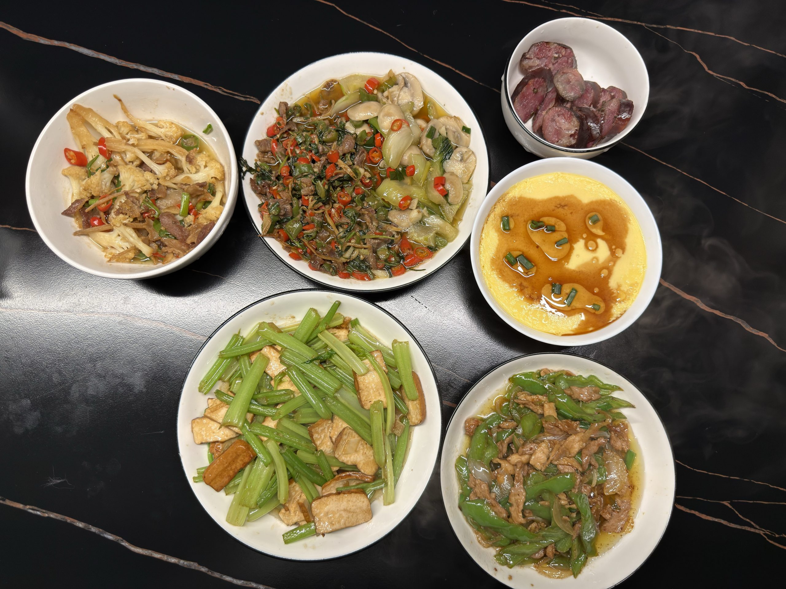 今日三餐。早上土豆面绝了,辣度刚刚好,土豆的味道沁润到汤中,面吃到嘴里的饱满,还有肉和香菇的香气,可以打90分。中午和晚上吃的炒菜,芹菜、花菜、青菜健康,小炒黄牛肉口味很好。