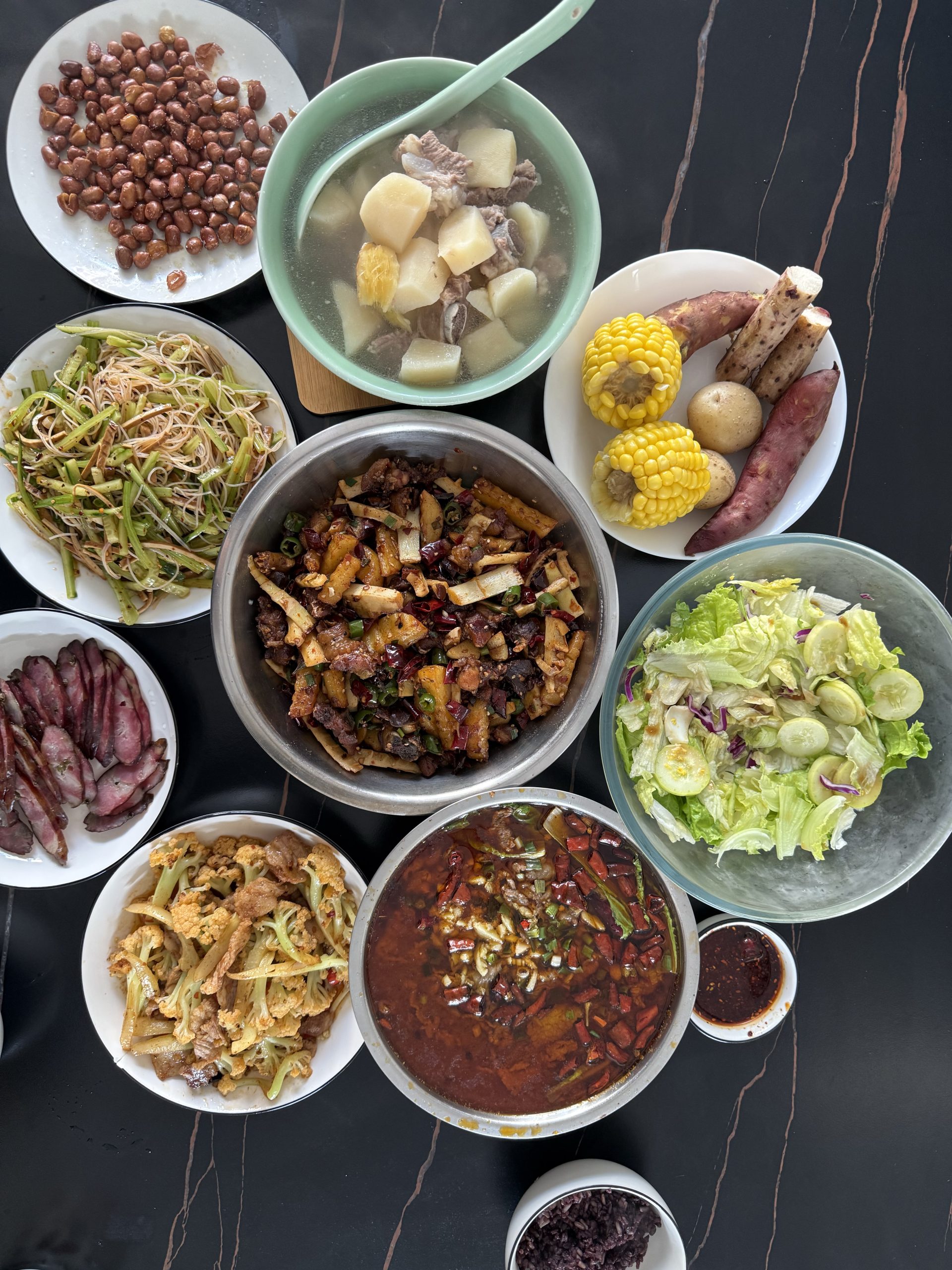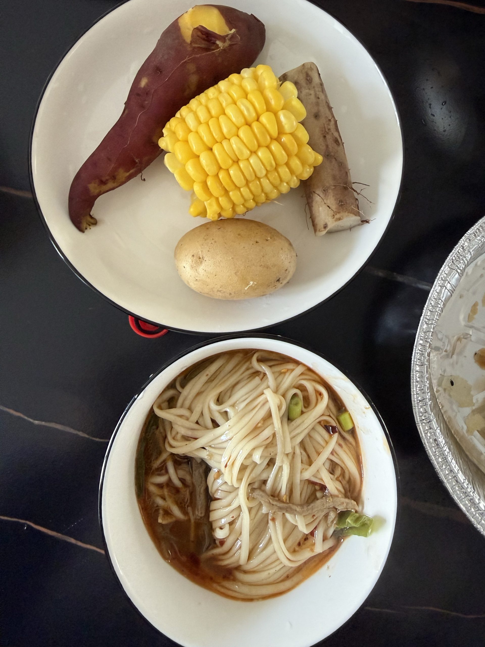 早中晚餐。山药面和山药炖汤挺好吃的,虽然是粗棍状,但味道和老家的手形状的山药味道差不多。现在在家主食也不吃饭了,吃杂粮。
