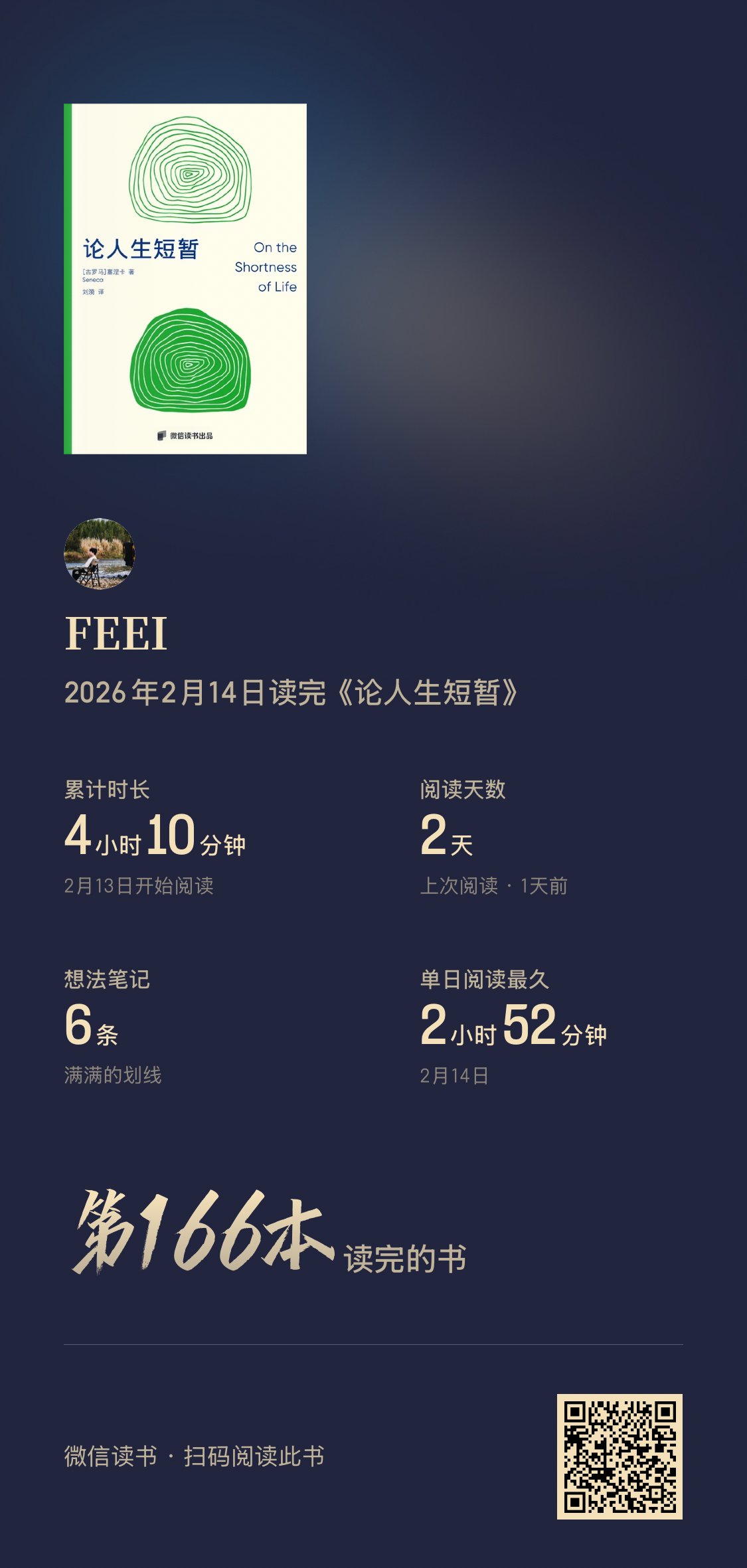 读完《论人生短暂》。我们一生中,真正活着的时间并不多,我们往往把大部分光阴消耗在无意义的事情上,才让生命显得短暂。让时间投入在自己主动选择觉得有意义的事情上。