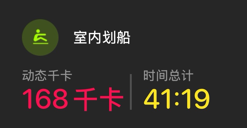 划船40分钟(第9天)。划船效率比较低,四十分钟才168千卡。获得完美一周奖章,从上周末到现在已经第九天连续打卡了。