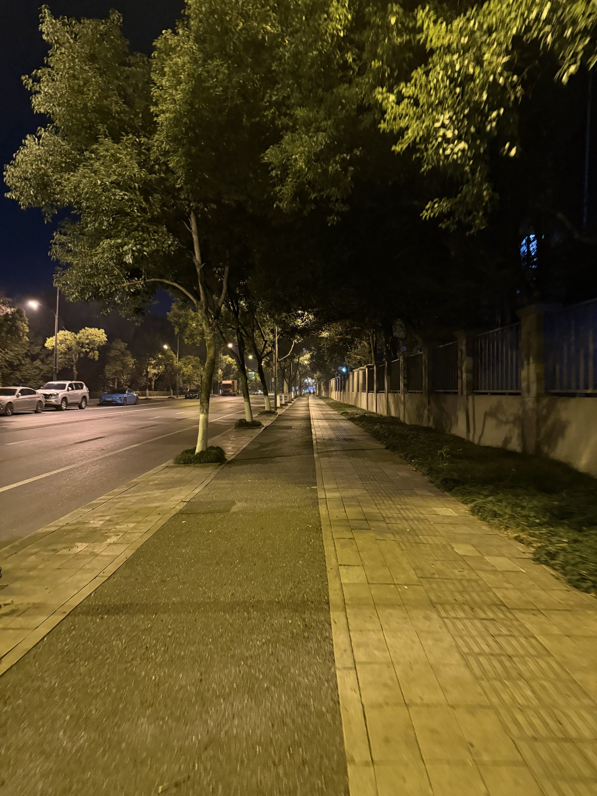 - 看完从电影院走回来,路两旁的树造出了一个遮阳路,还能看到天上的星星。