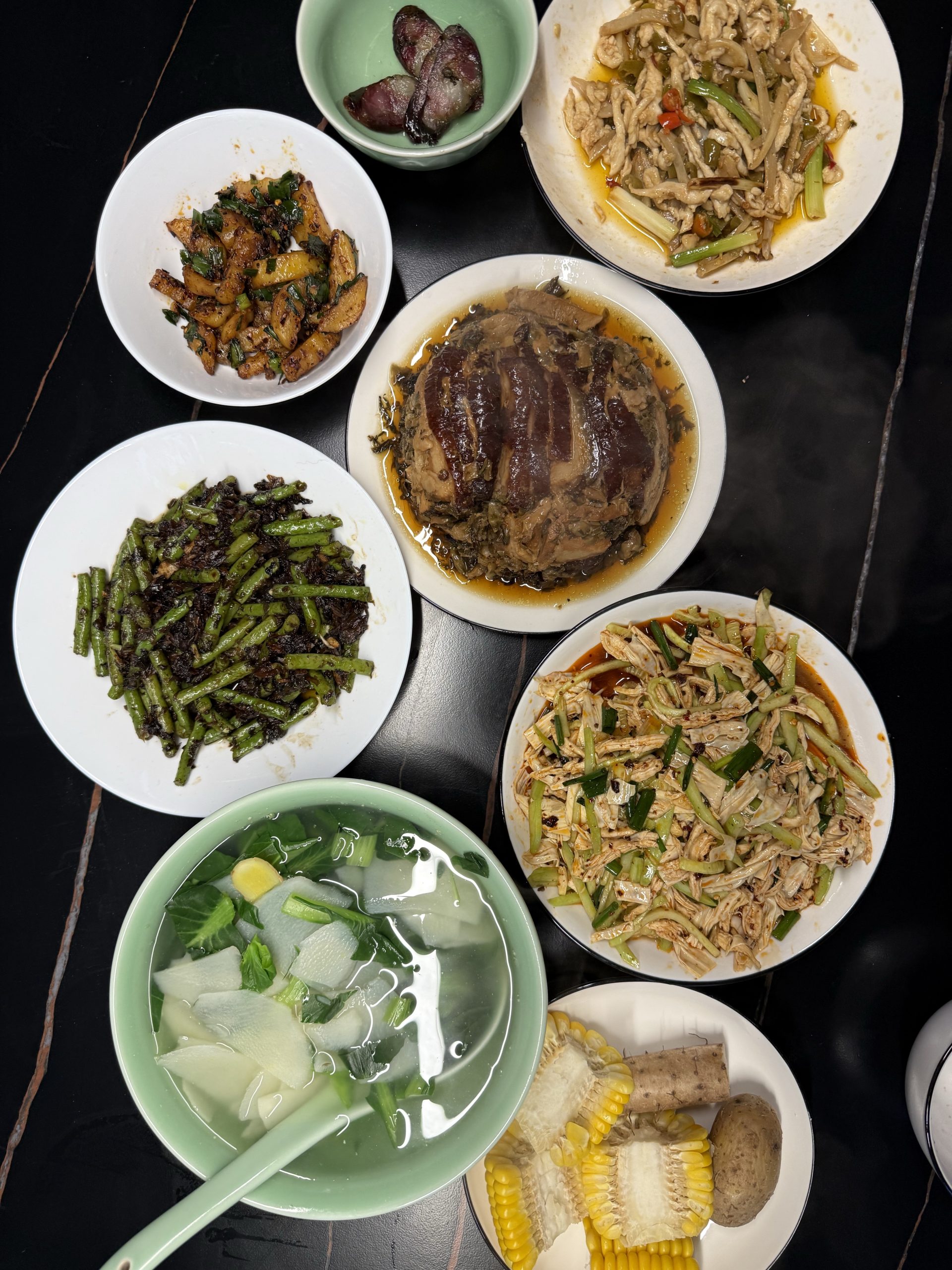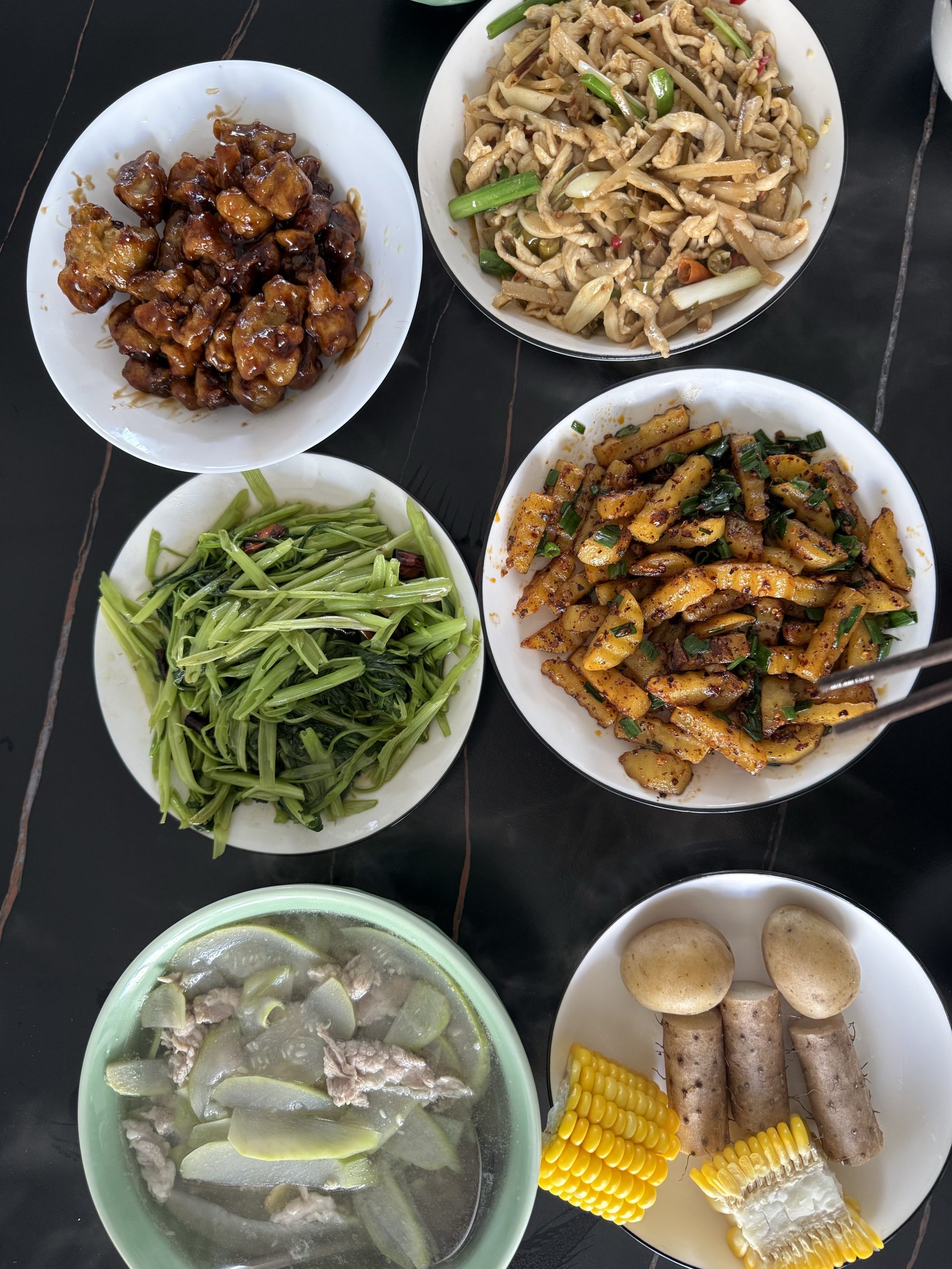 早中晚饭。今日早饭没吃,午饭土豆条不错。下午在二楼晒太阳,吃着坚果看着电视剧,幸福感很强。晚饭的凉拌菜不错,和外面买的卤菜无差。