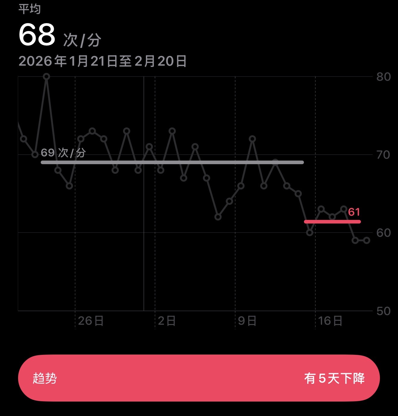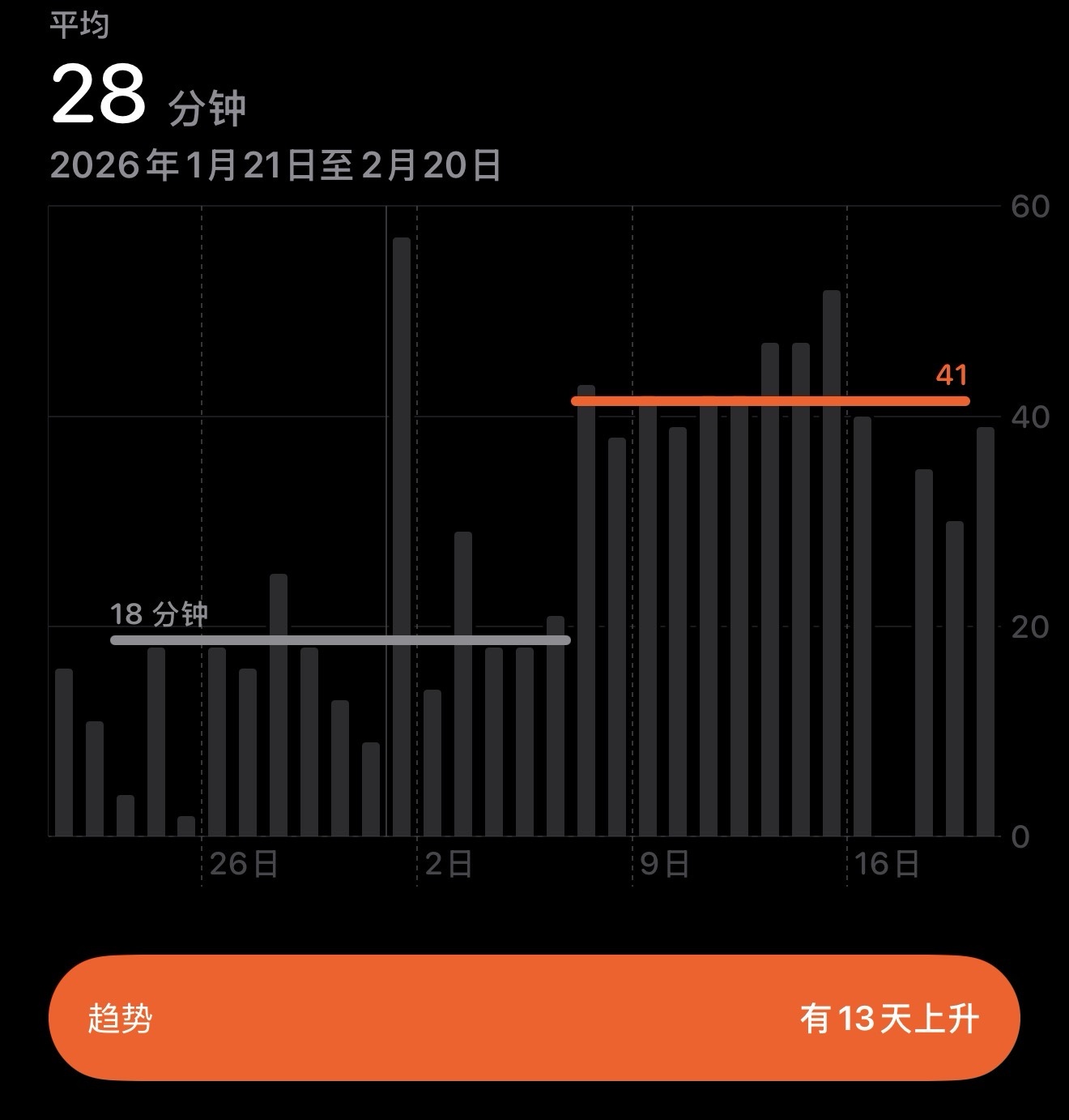 体重144.8,下降0.6。划船15分钟。静息心率在过去五天有所降低,从原先平均69次每分钟,降低到61次每分钟。意味着心脏泵血更有力,不需要跳那么快。保持在60以下就是体能比较好情况了。锻炼分钟数也从原先18分钟每天增加到近13天每天41分钟。