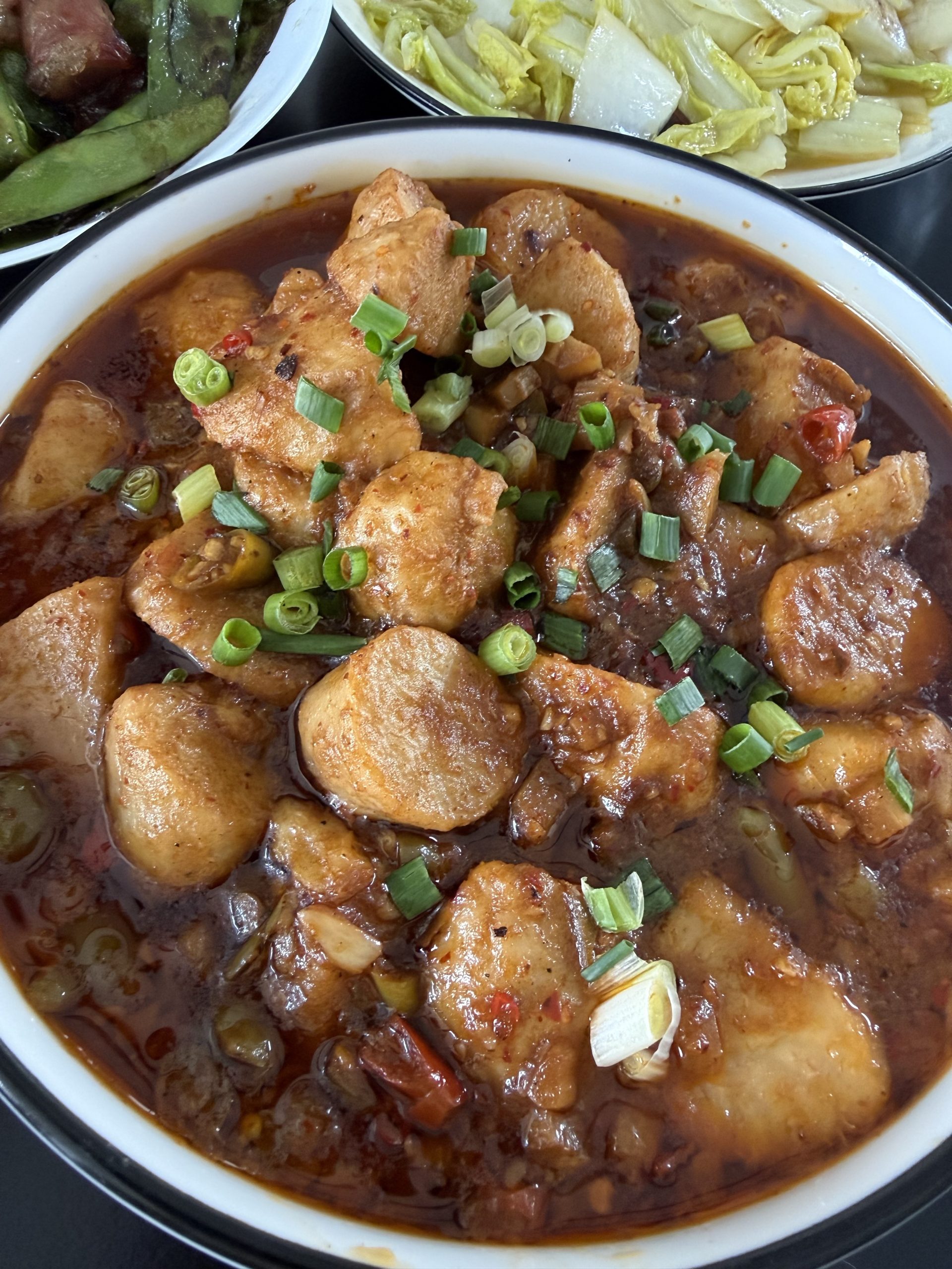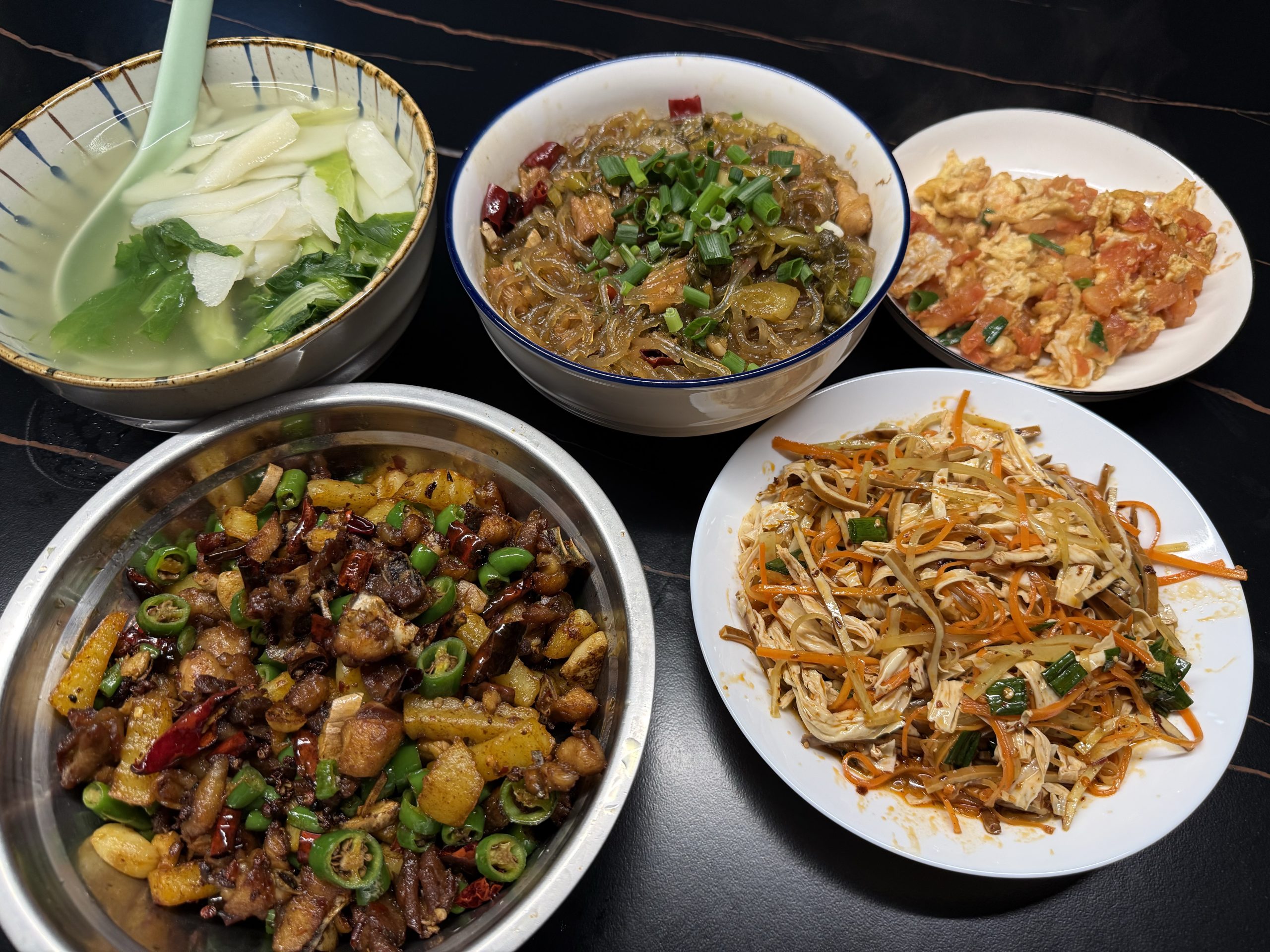- 晚饭,辣子鸡丁、酸菜白肉炖粉条。