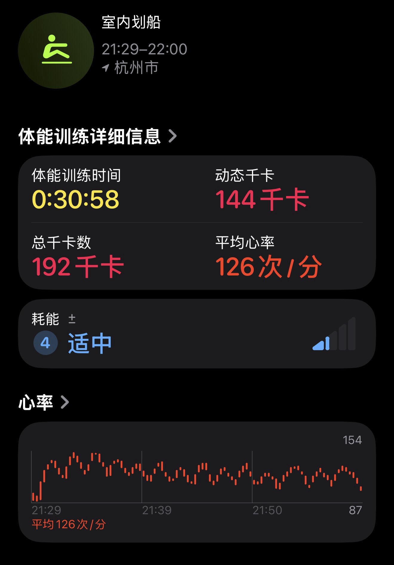 - 晚上,划船30分钟,542米,平均心率126。按照全力划一分钟再歇一分钟模式,效率和可持续更高。