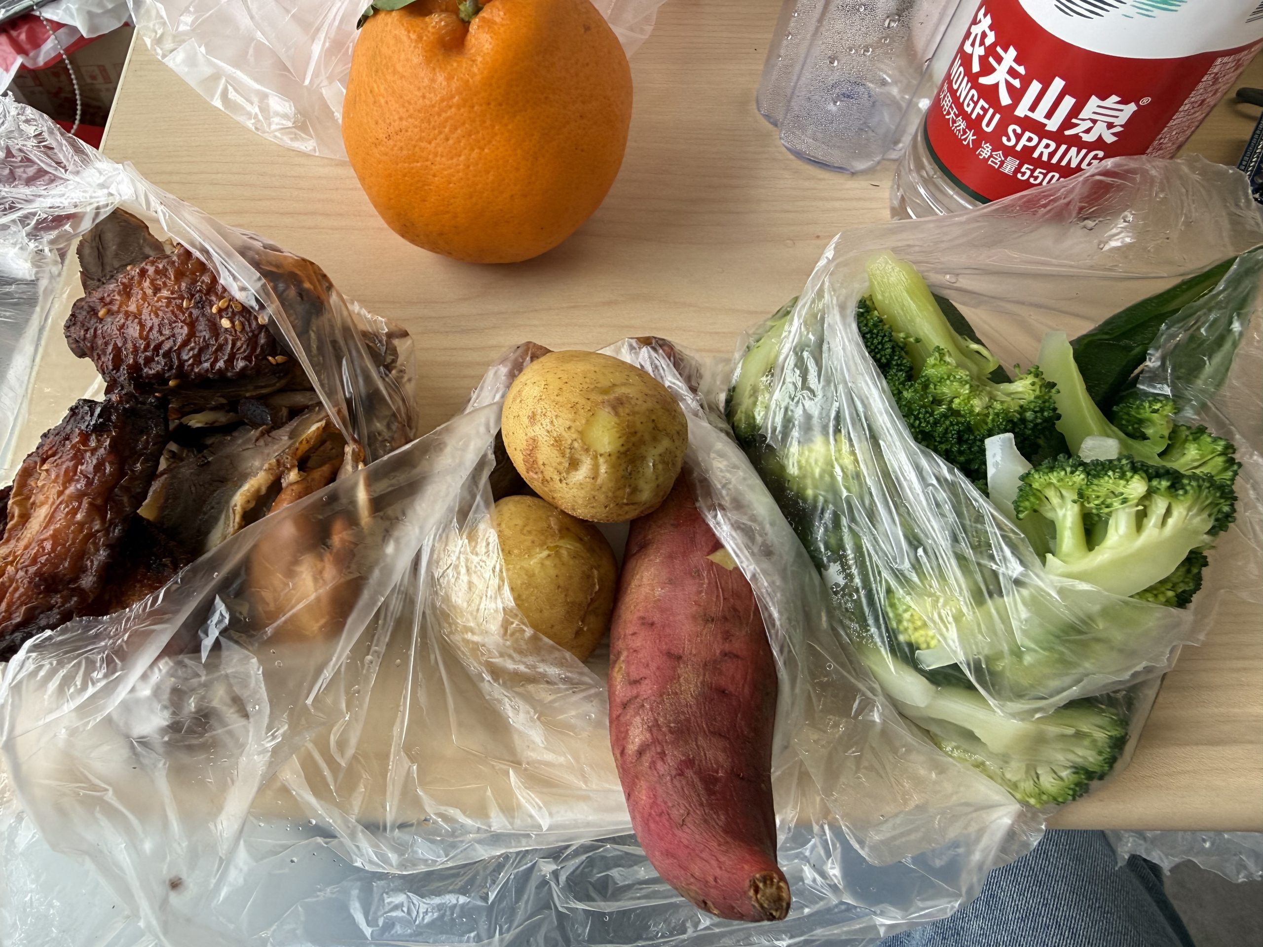 - 午餐,卤牛肉/烤鸡翅,蔬食。