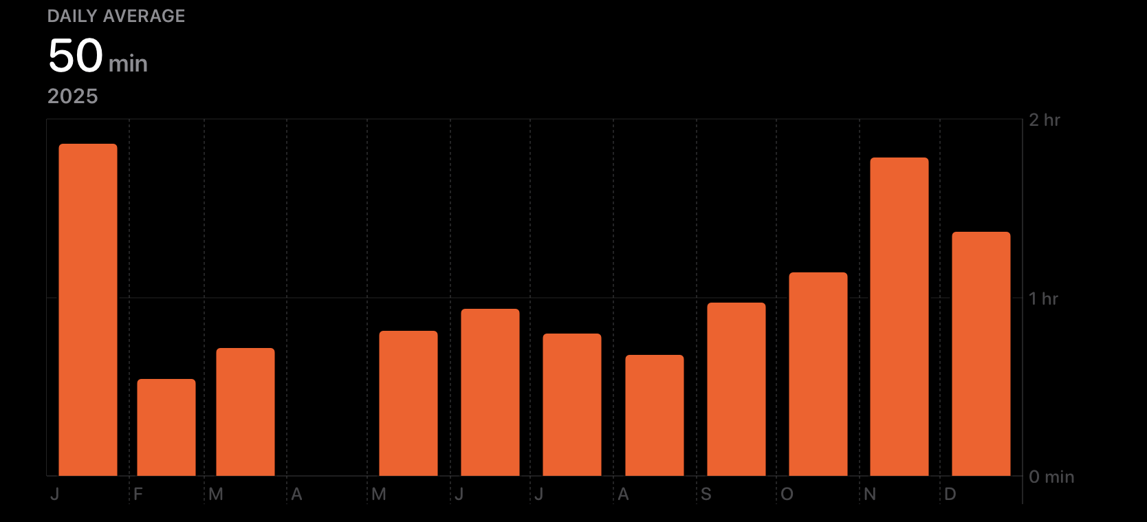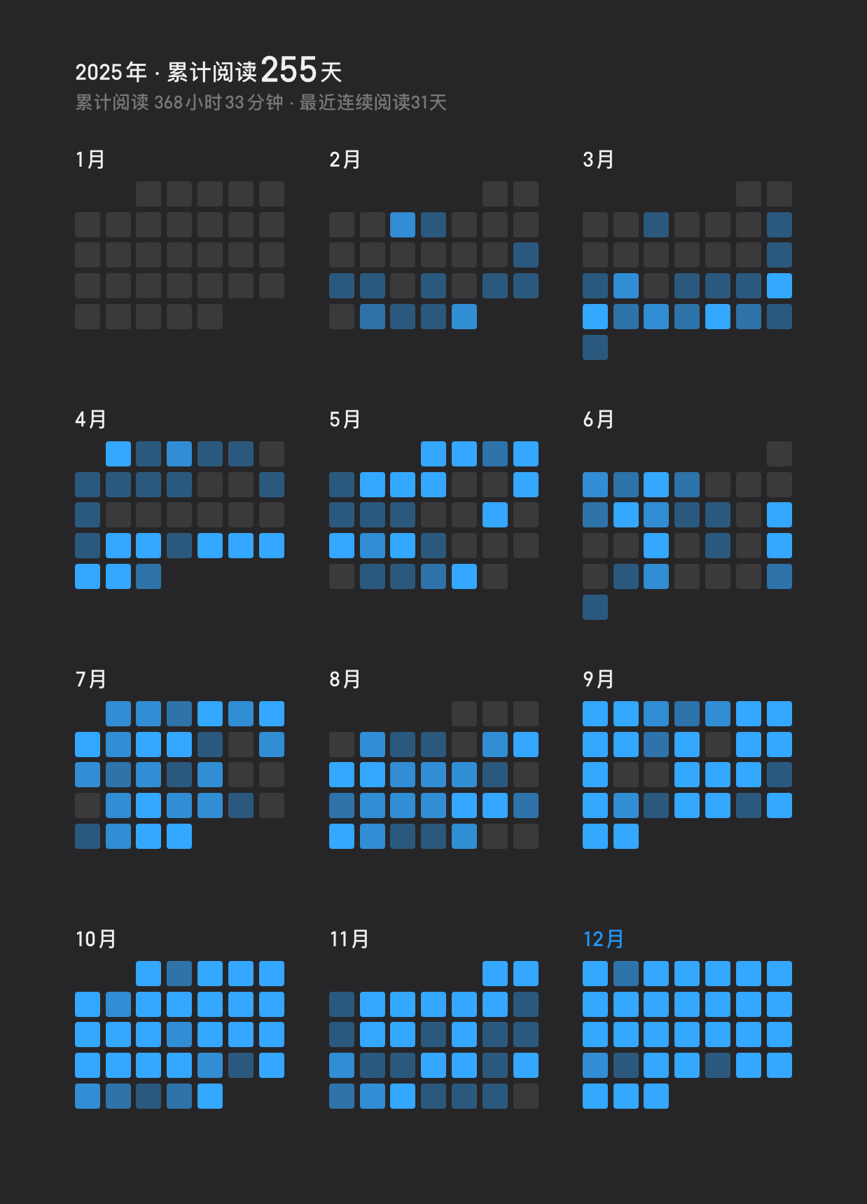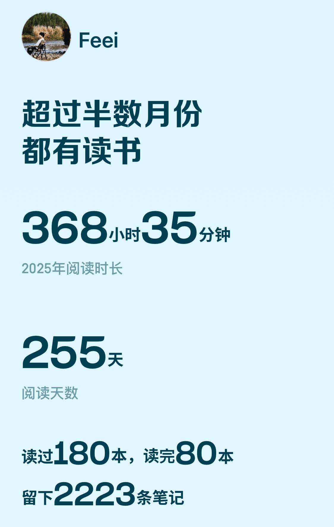 2025 年,我累计阅读 80 本书,阅读 255 天,总时长超过 368 小时(较去年增长 133%),平均每天约 60 分钟,并留下 2223 条阅读笔记。今年阅读主要围绕经济理财与个人提升方面。推荐成事类:《赢》、传记类:《源代码》、管理类:《知行》、投资类:《一个投资家的20年》、人文类:《人间杭州》。