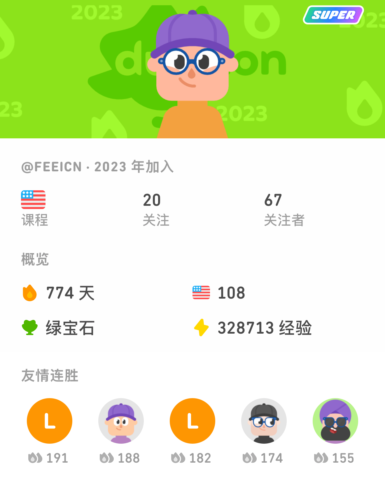 (多邻国中搜索feeicn可添加好友,一起学习英语。)