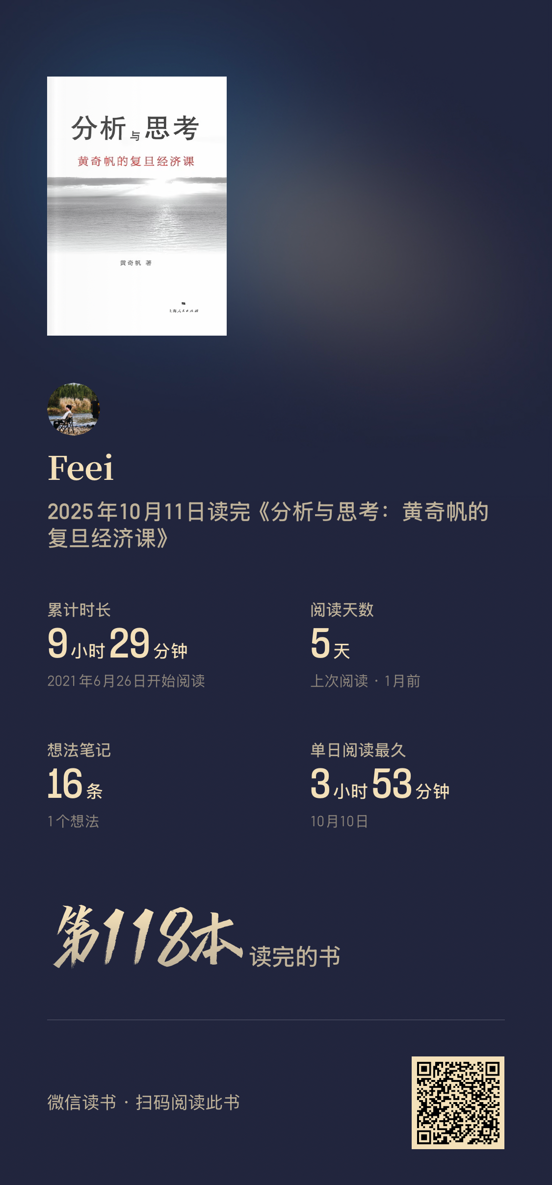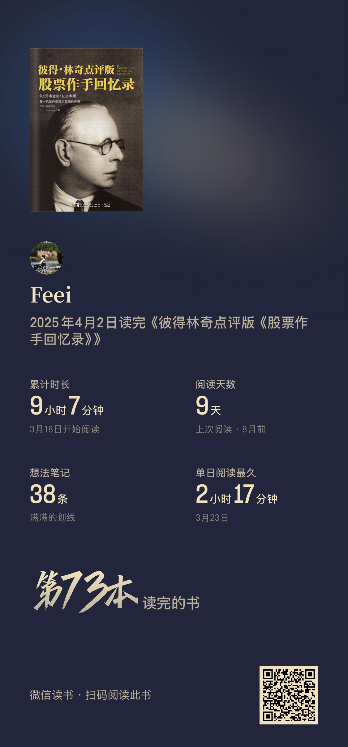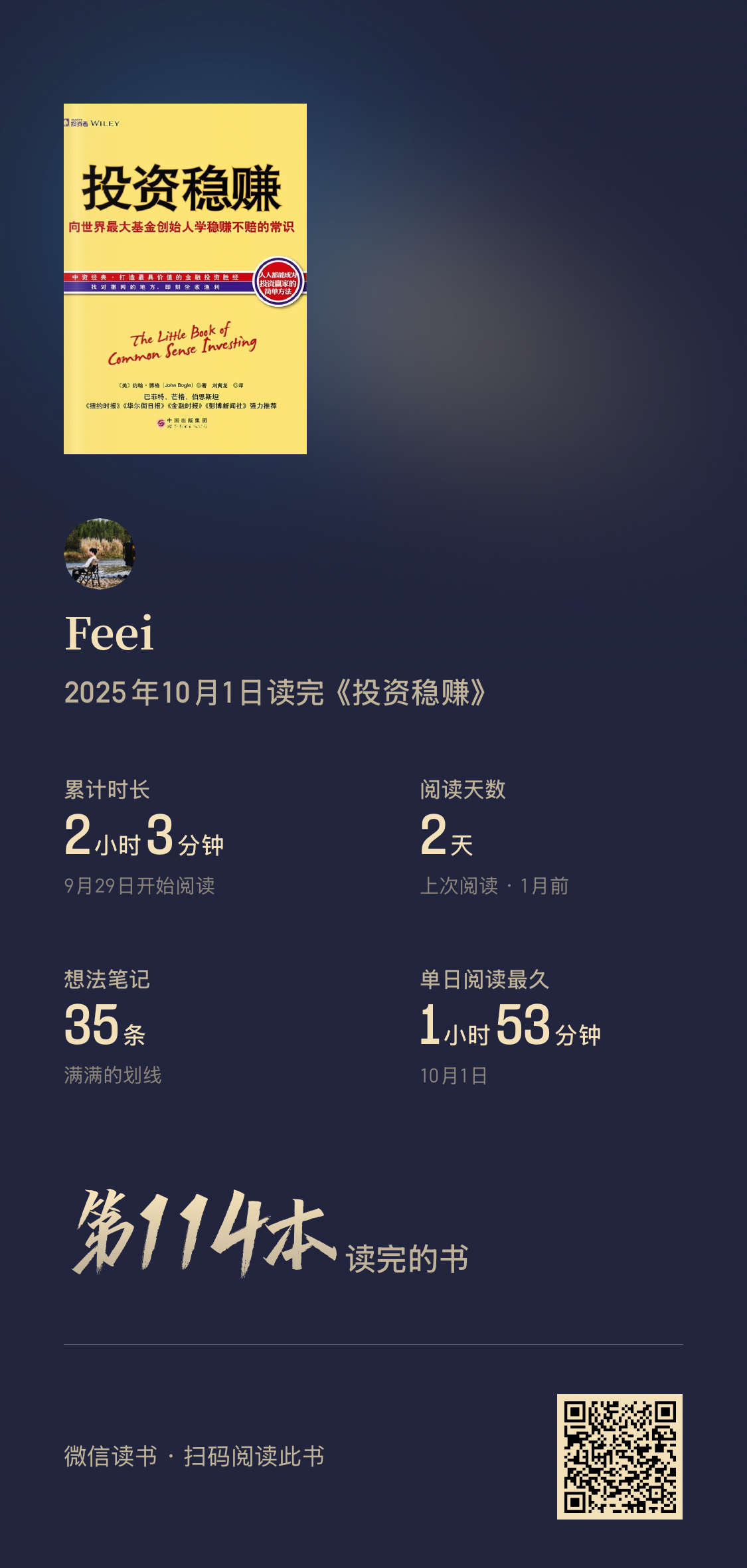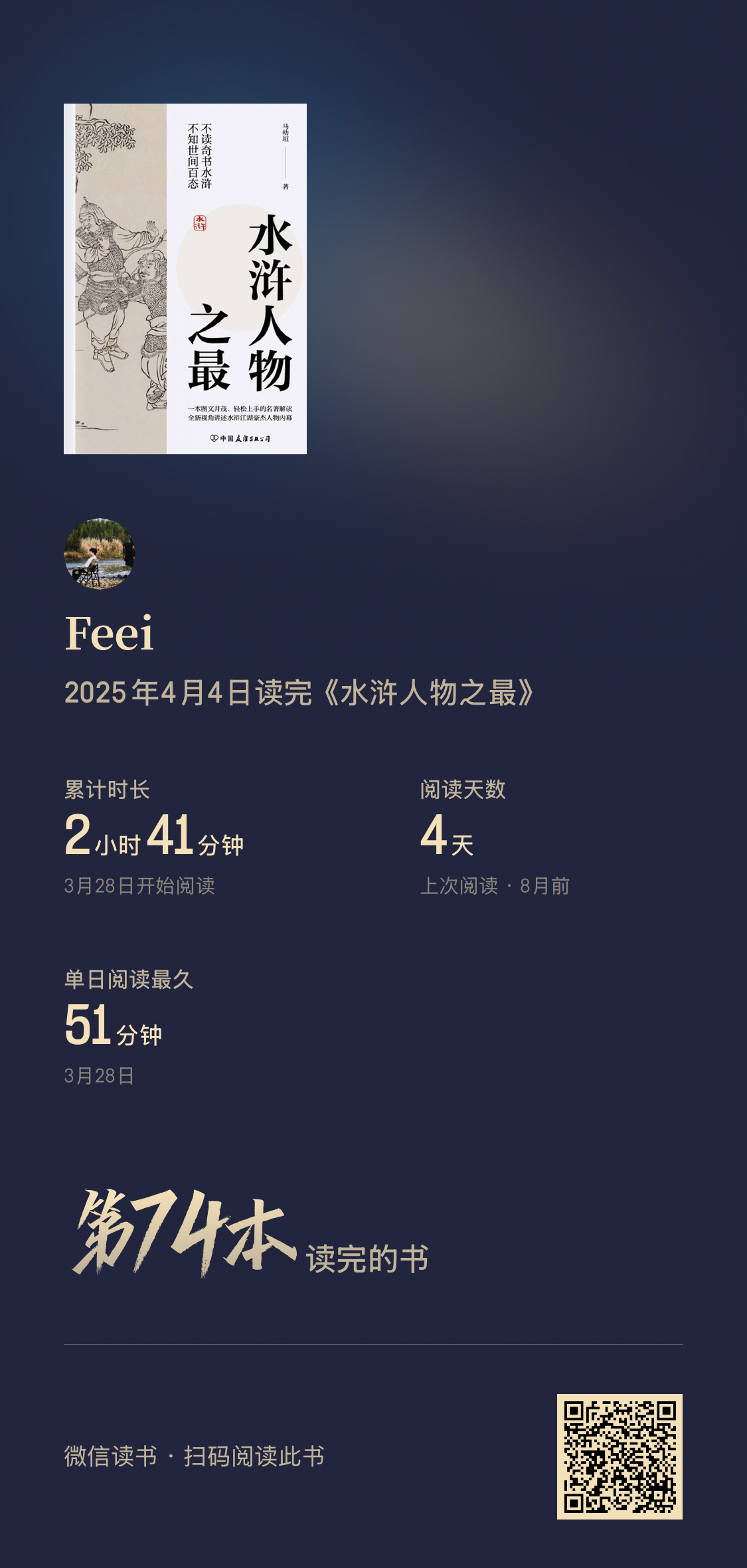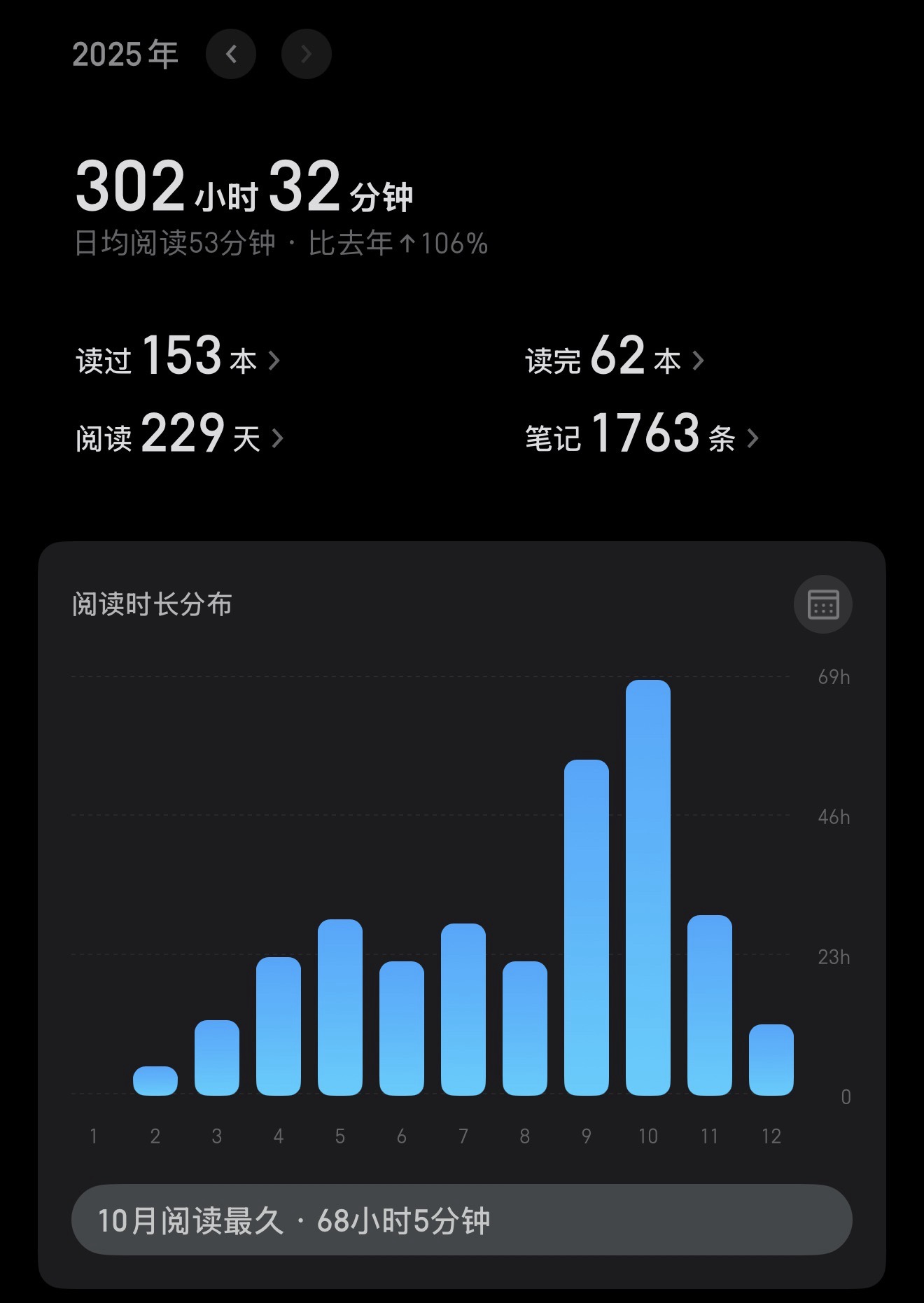 阅读完74本书,阅读时间较去年增加127%(超过355小时)。平均每天60分钟阅读,9月和10月阅读量最大。