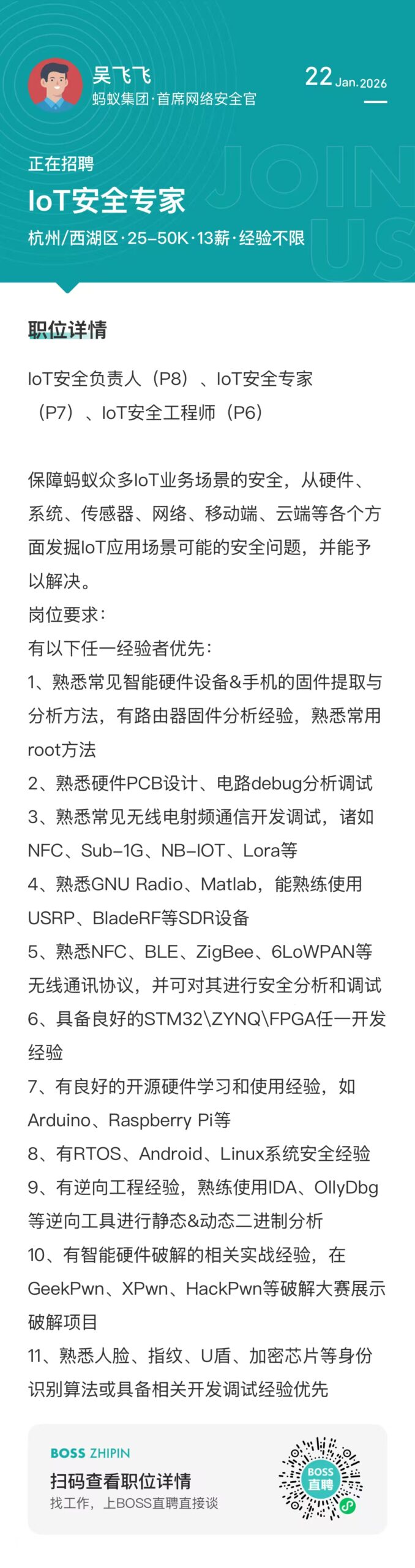 本岗位招聘IoT安全负责人(P8)、IoT安全专家(P7)、IoT安全工程师(P6)。