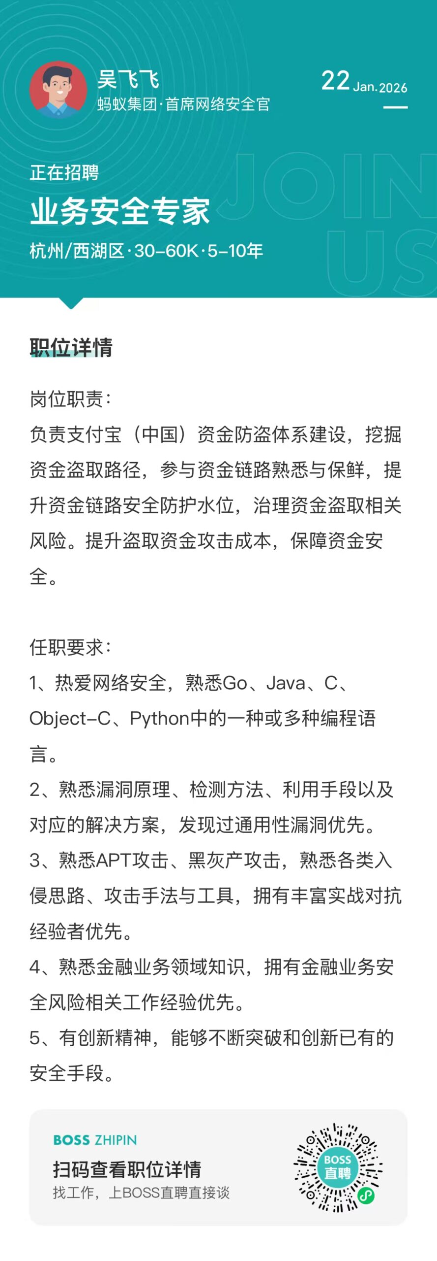 支付宝安全团队致力于打造国际一流的安全体系,创造对行业有益的安全理念、安全实践、安全产品以及漏洞等。业务对安全有极高的要求,拥有大量极具挑战的网络安全场景,需要与众多顶级攻击者与黑灰产斗争。